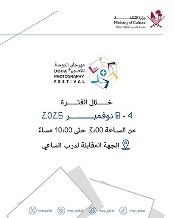 تعلن وزارة الثقافة القطرية عن تنظيم النسخة الثانية من مهرجان الدوحة للتصوير، الذي يُقام خلال الفترة من 4 إلى 9 نوفمبر 2025 في الساحة المقابلة لمقر درب الساعي، بمشاركة نخبة من المصورين المحليين والدوليين، وعدد من المؤسسات الفنية والثقافية المهتمة بفن التصوير الضوئي.