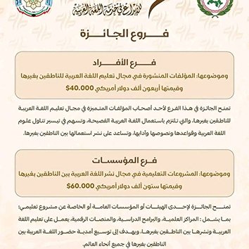 تمنـــــــح الجائـــــزة لإحــــــدى الهيئـــــات أو المؤسسـات العامــــة أو الخاصـة عن مشـروع تعليمــي؛ بما يشمل : المراكز العلمية، والبرامج الدراسية، والمنصات الرقمية، يعمل على تعليم اللغة العربية ونشرها بين الناطقين بغيرها، ويهدف إلى توسيع أمدية حضور اللغة العربية بين الناطقين بغيرها في جميع أنحاء العالم.